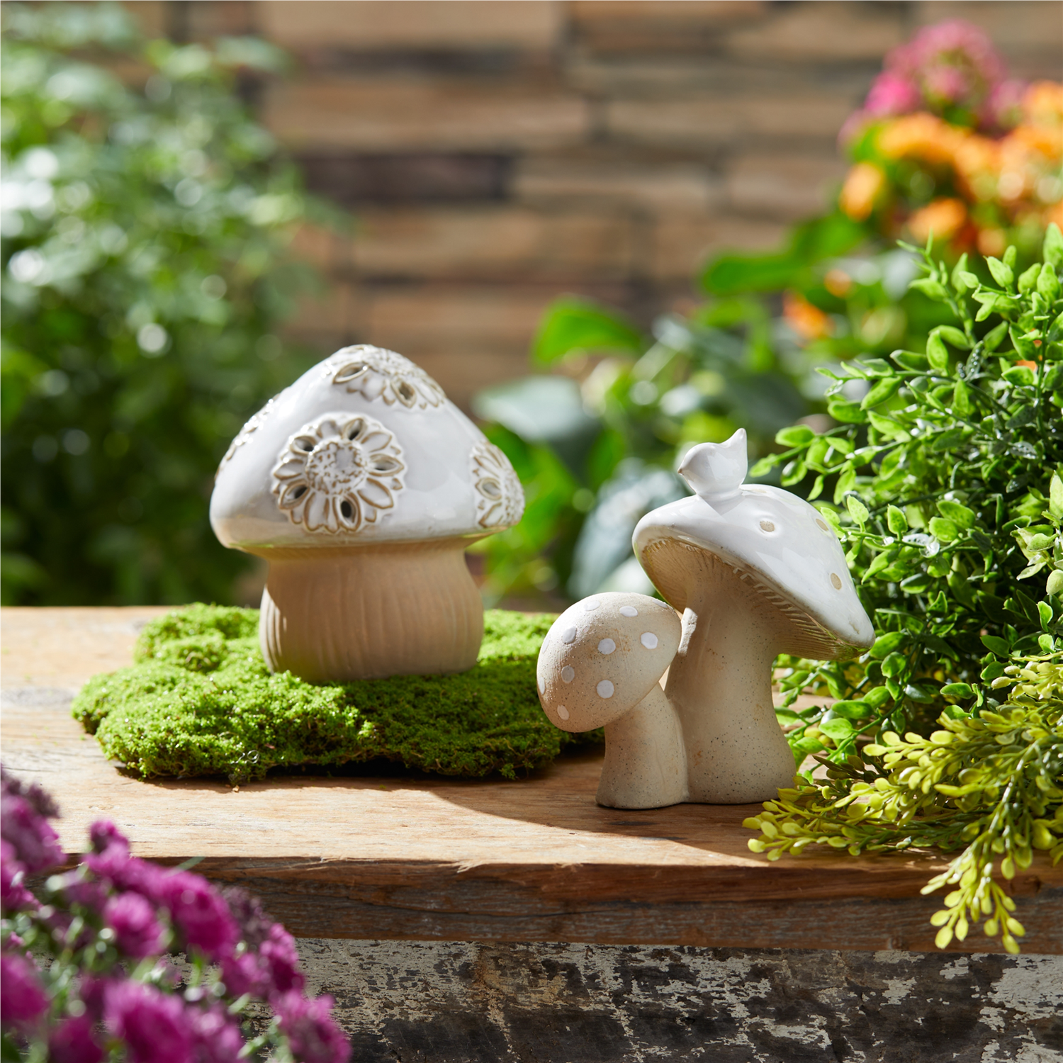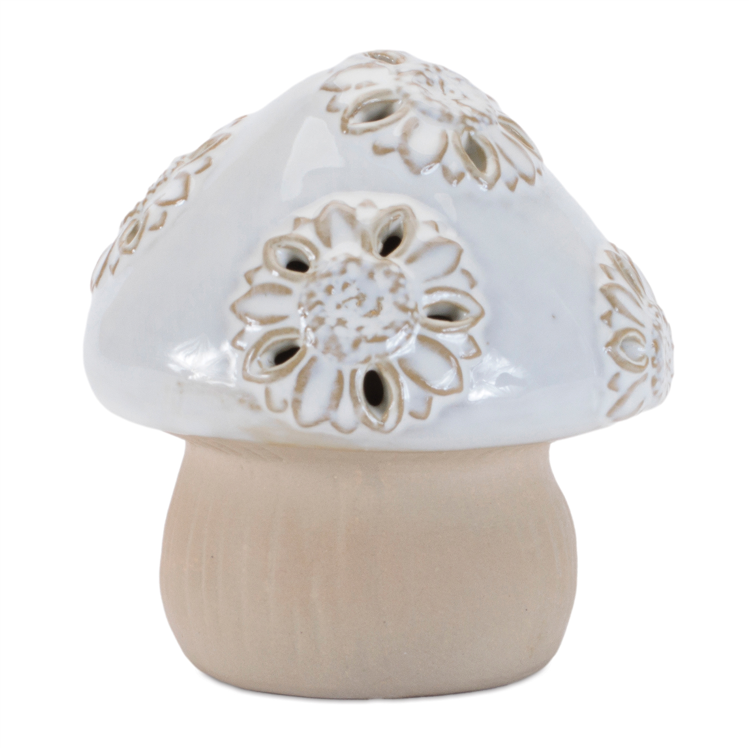 Bring nature-inspired charm to your space with this set of six Porcelain Mushroom Decor pieces. Crafted from fine porcelain, these whimsical mushrooms feature soft beige and grey tones with delicate glazed touches. The etched floral and polka dot designs on the mushroom tops, along with the playful bird accent, create a friendly, nature-filled atmosphere. Perfect for bookshelves, tabletops, or mantels, these mushrooms add a delightful, cozy touch to any room.