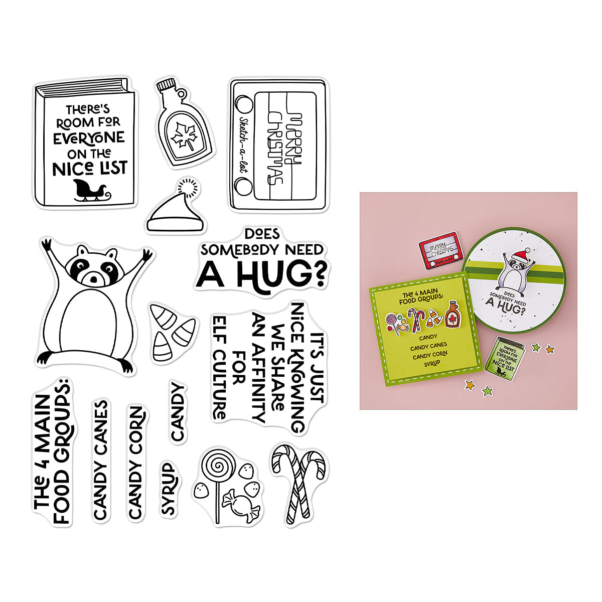 The Elf Culture Clear Stamp Set features 15 whimsical stamps inspired by classic holiday cheer and elf traditions. With playful images like a bottle of maple syrup, candy, a raccoon, and quotes such as “Does somebody need a hug?” and “The 4 main food groups,” this set is perfect for creating fun, festive cards, tags, and crafts full of elf-inspired personality.