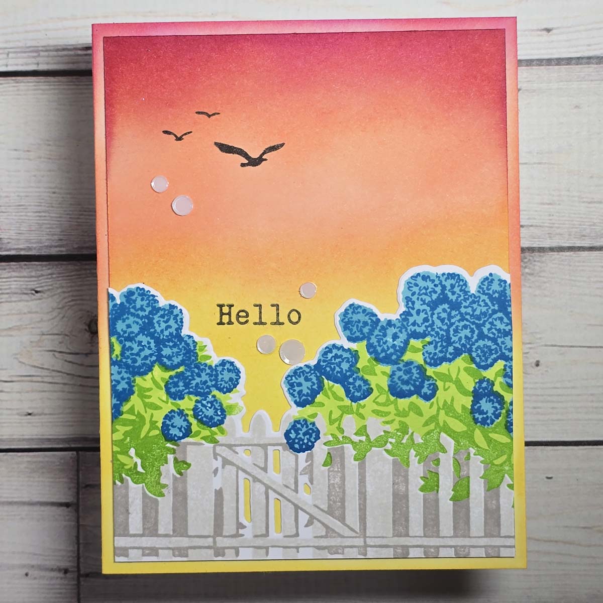 The Coastal Blooms HeroScape Clear Stamp Set brings the breezy charm of a seaside garden to life with beautifully layered stamping. This?6" x 8" clear stamp set features a buildable coastal scene filled with blooming hydrangeas, a picket fence, flying birds, and thoughtful sentiments like “Hello” and “Miss You.”
