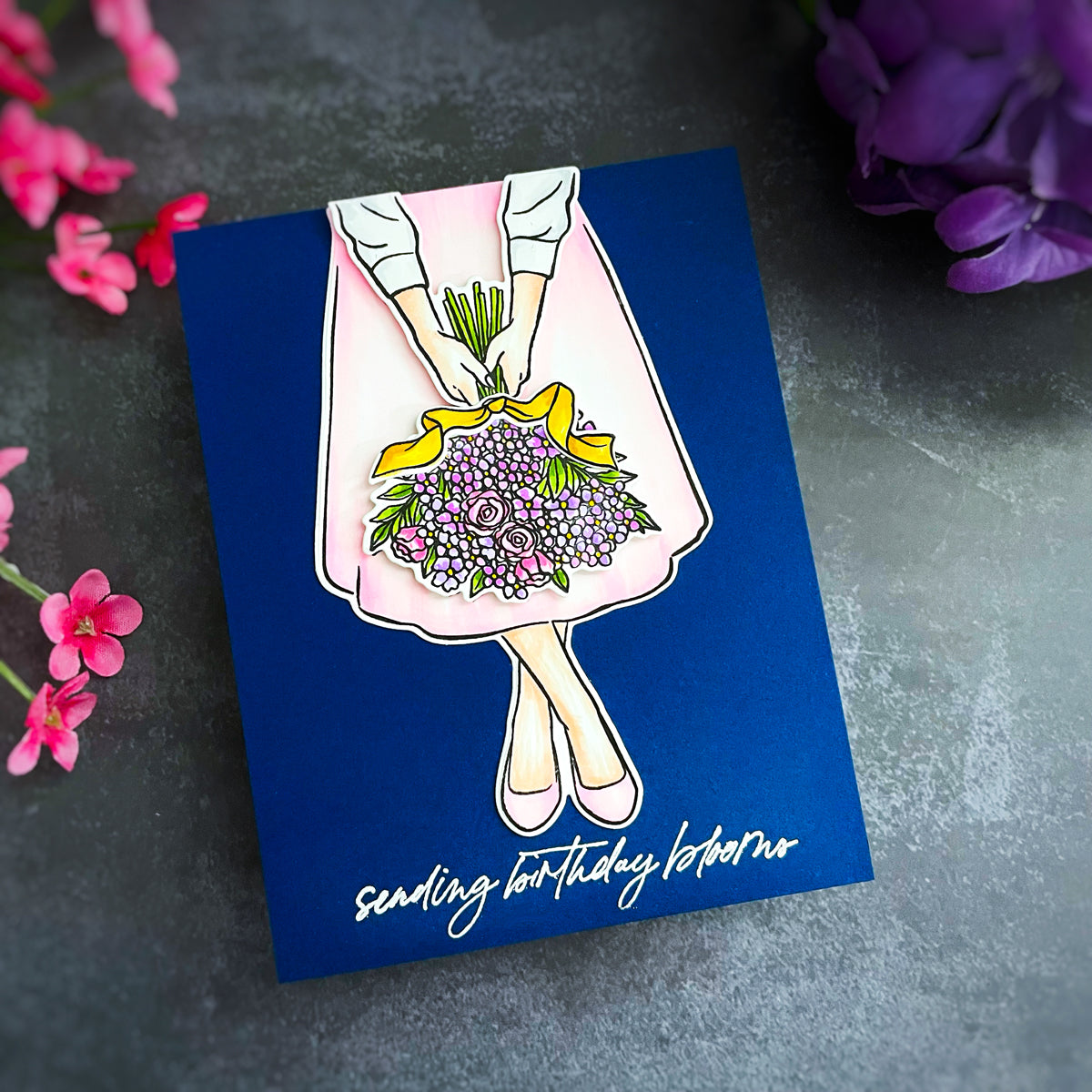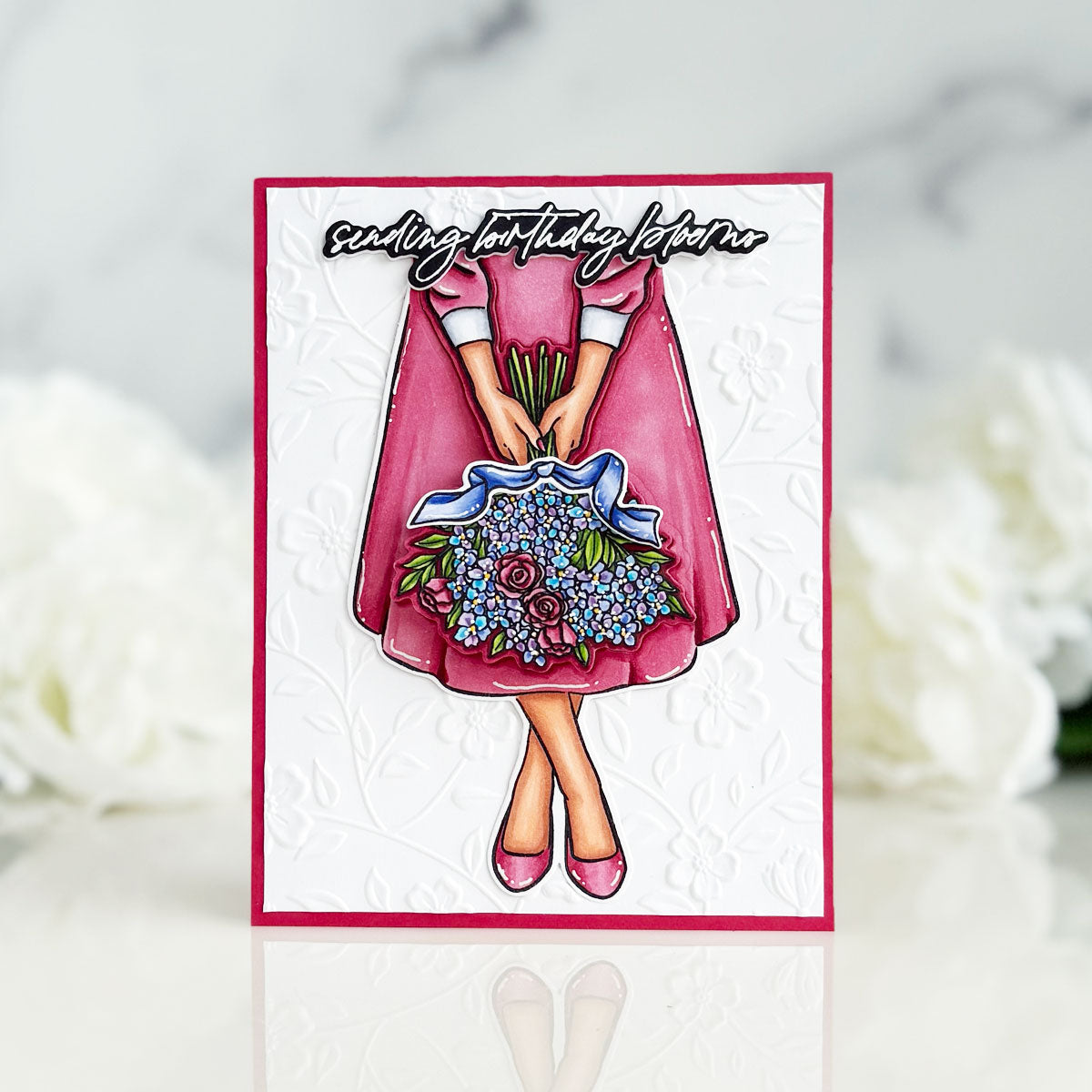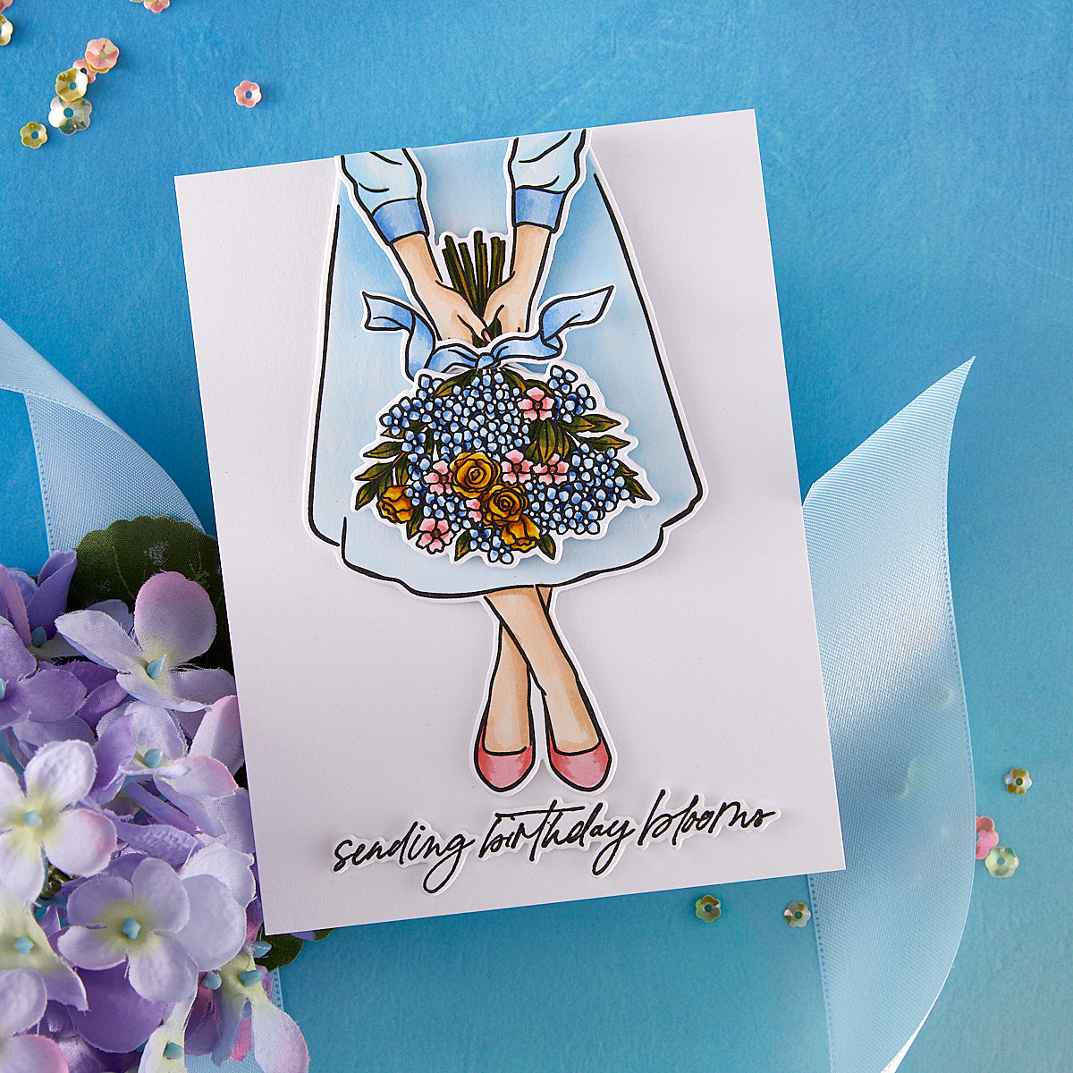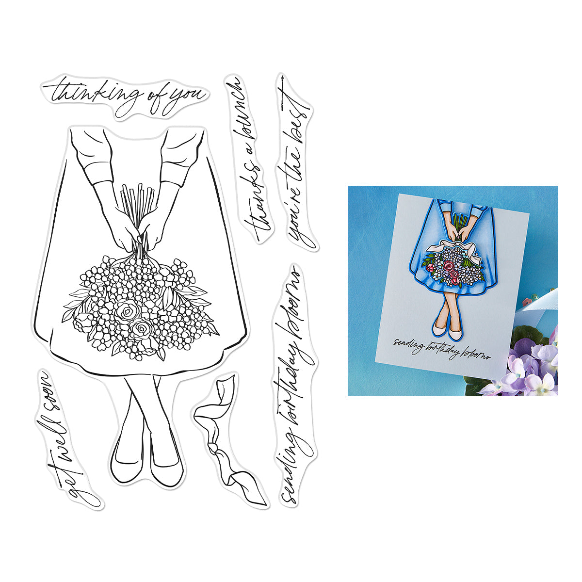 The Summer Bouquet Stamp Set captures the simple elegance of a heartfelt moment with graceful, hand-drawn style. This 4"x6" clear stamp set features the charming image of a woman holding a full bouquet, accompanied by a collection of versatile sentiments in flowing script.
