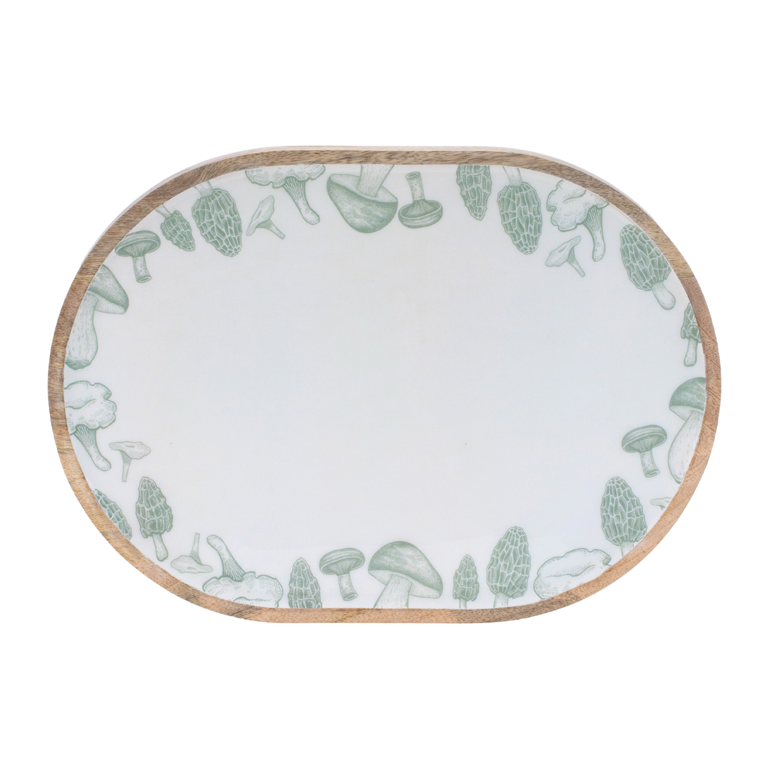 Bring nature's charm to your home with the Wood Mushroom and Floral Print Tray set. Featuring soft white and sage green tones, these trays are complemented by a natural wood grain trim, creating a beautifully rustic yet refined look. Delicate mushroom and floral print outlines add a whimsical touch, making these trays perfect for showcasing your favorite decor. Sold as a set of two assorted sizes and designs, they are ideal for displaying on coffee tables or end tables with vases, candles, or novelty accents. These trays seamlessly fit into garden chic or woodland-inspired decor styles.