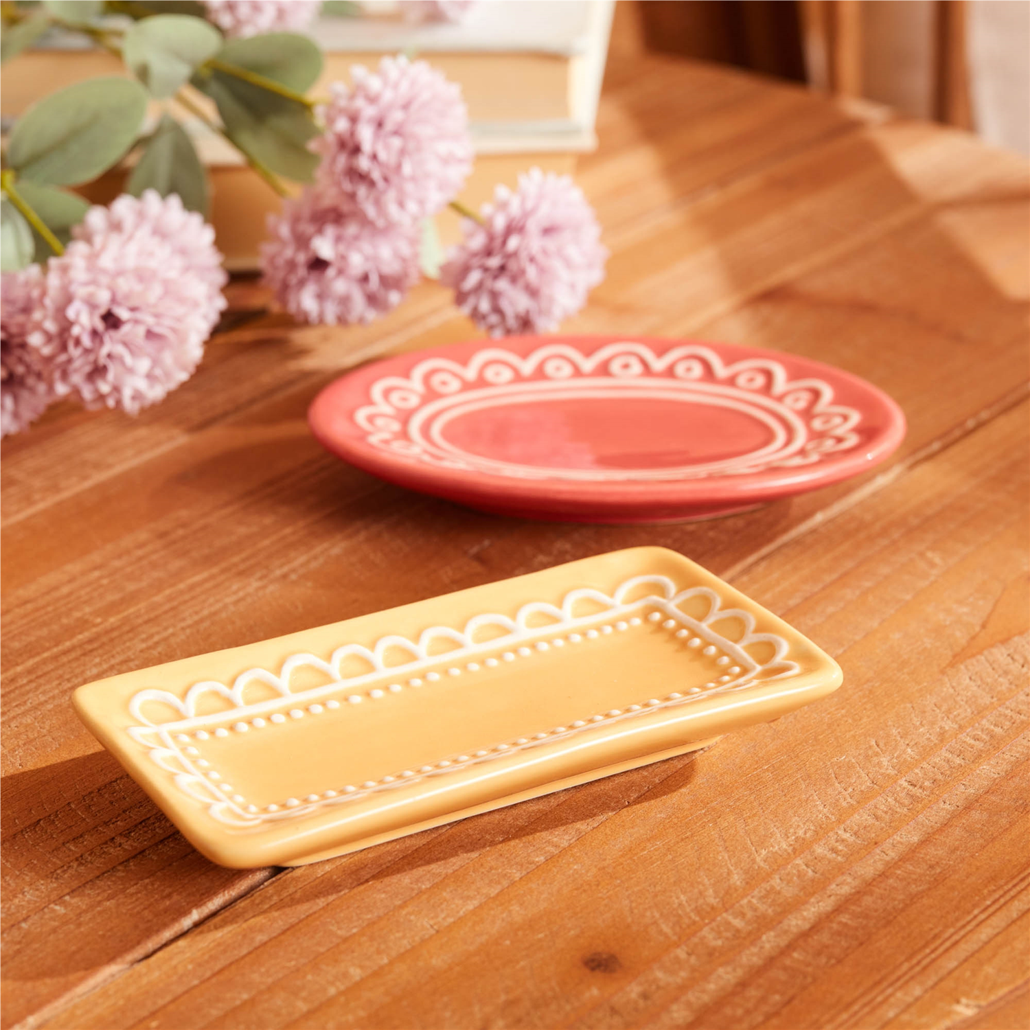 Add a splash of color and charm to your tabletop with this Set of Ceramic Trinket Dishes. Featuring a set of 12 with two assorted designs in bright yellow and pink tones, each dish boasts a shiny glazed finish and elegant scalloped edges in unique oval and triangle shapes. Whether you're hosting a spring gathering or looking for thoughtful holiday gifts, these versatile pieces are perfect for displaying sweet treats, party favors, or small keepsakes. A timeless accent with endless uses – ideal for every occasion and every season.