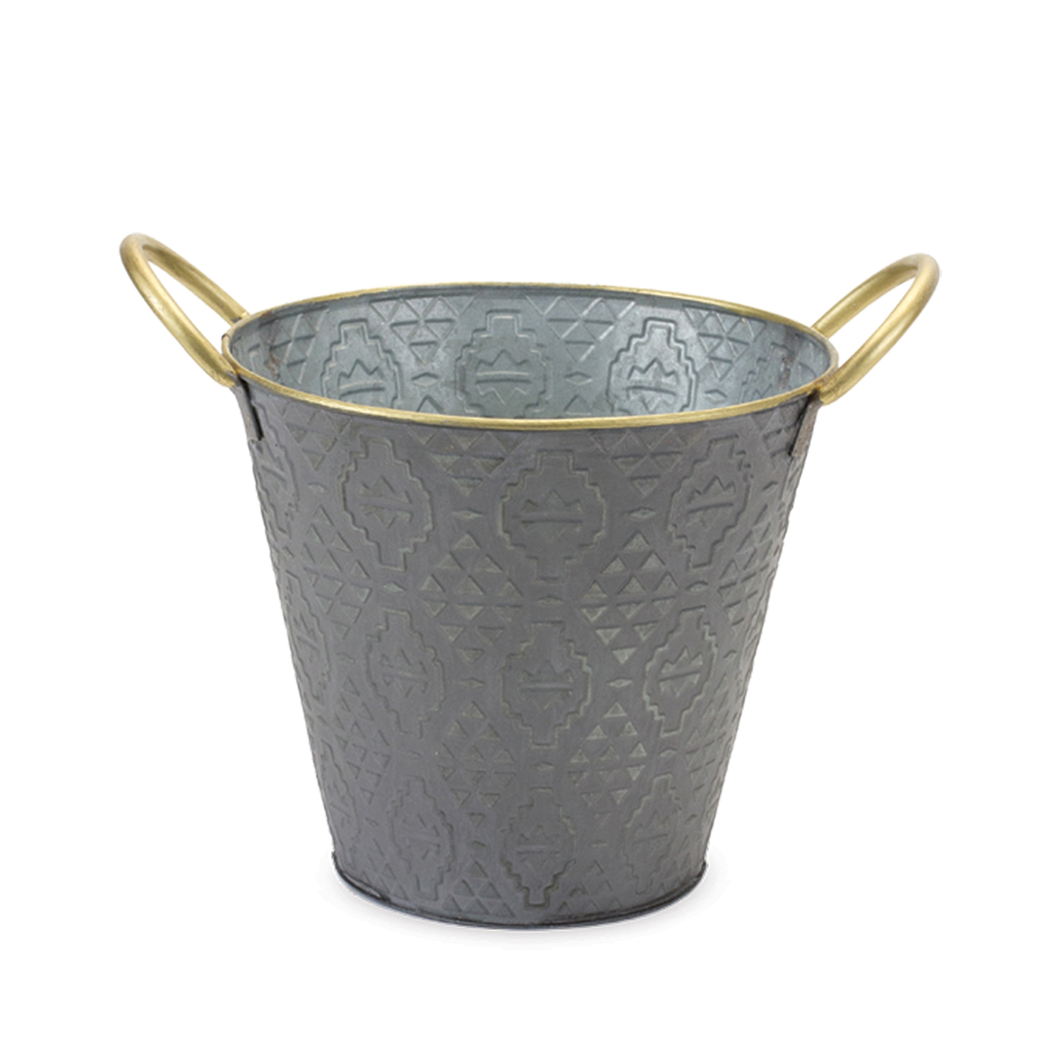 Elevate your plant display with this stylish Set of Metal Aztec Pail Planters. Crafted from durable metal and finished in distressed grey with chic gold accents, these planters boast a bold geometric Aztec design that adds a touch of luxury to any space. Ideal for both indoor and covered outdoor use, they make the perfect vessels for faux or real plants. Whether placed in your outdoor-covered patio, entryway, or living room, these planters offer a modern boho vibe and timeless charm. Sold in a set of three assorted sizes to create a balanced and memorable display in your home or patio setting.