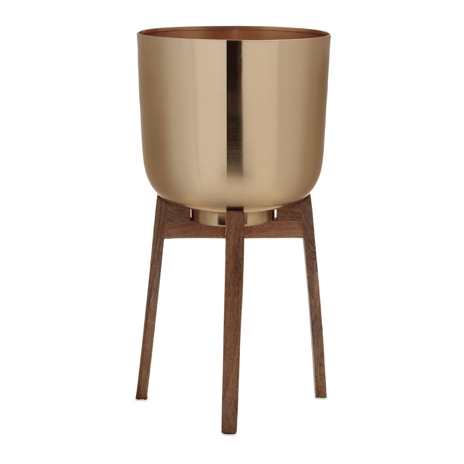 Elevate your indoor plant displays with this chic set of two round metal planters, each featuring a sleek metallic gold finish and a rustic mango wood tripod base. The unique combination of modern metallic tones with the natural beauty of wood creates a sophisticated and stylish look for any room. Perfect for showcasing real or faux potted plants, these planters come in two assorted sizes, adding versatility and a touch of contemporary charm to your home decor. Best for indoor use, these planters complement modern and contemporary styles beautifully.