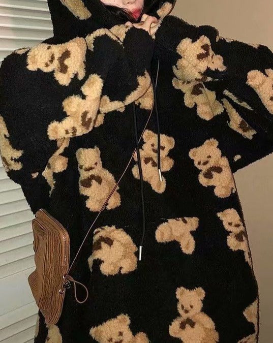 Details: Wool-like hoodie top with Teddy Bear print pattern
