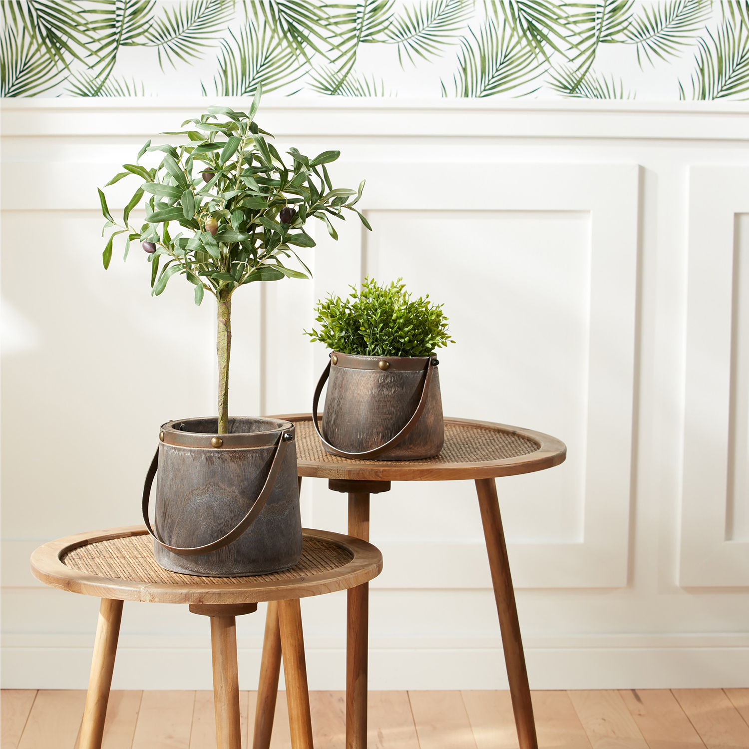 Add rustic charm to your living space or garden with this set of natural wooden pail planters. Featuring a distressed wood finish and steel handles with bead accents, these versatile pails bring warmth and texture to any decor. Perfect for both indoor and outdoor covered use, they make a stylish base for faux florals, dried arrangements, or potted plants. Whether enhancing your tabletop, entryway, or porch, this set of planters adds a cozy farmhouse touch wherever placed. Sold in a collection of two assorted sizes to create a balanced and memorable display in your home.